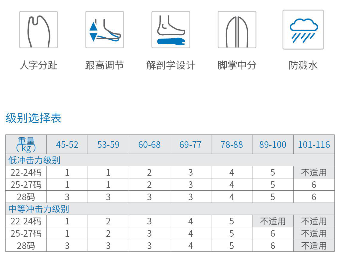 轻质的脚套设计符合人体解剖学,而且更加小巧,Z小尺码的脚板也可以轻松穿进。结实稳定的脚套底部可以在潮湿光滑的地面安全行走,人字分趾特征则可以穿上各种鞋子,包括人字拖。此外,22-26码的脚板还可以选配同样轻质耐用的小腿包装套,包装套可以适用于对线调整。